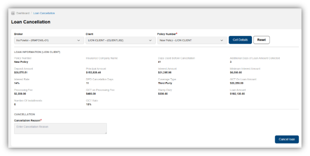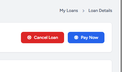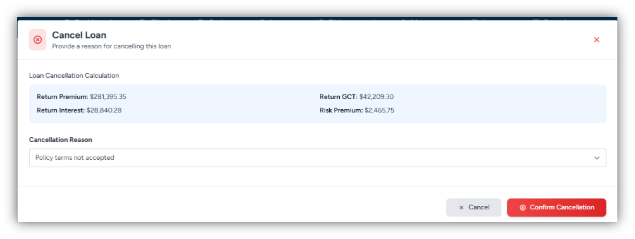A Cancel loan Pop-Up will appear like cancellation details. User can cancel the loan at any time while it is active by choosing a cancel