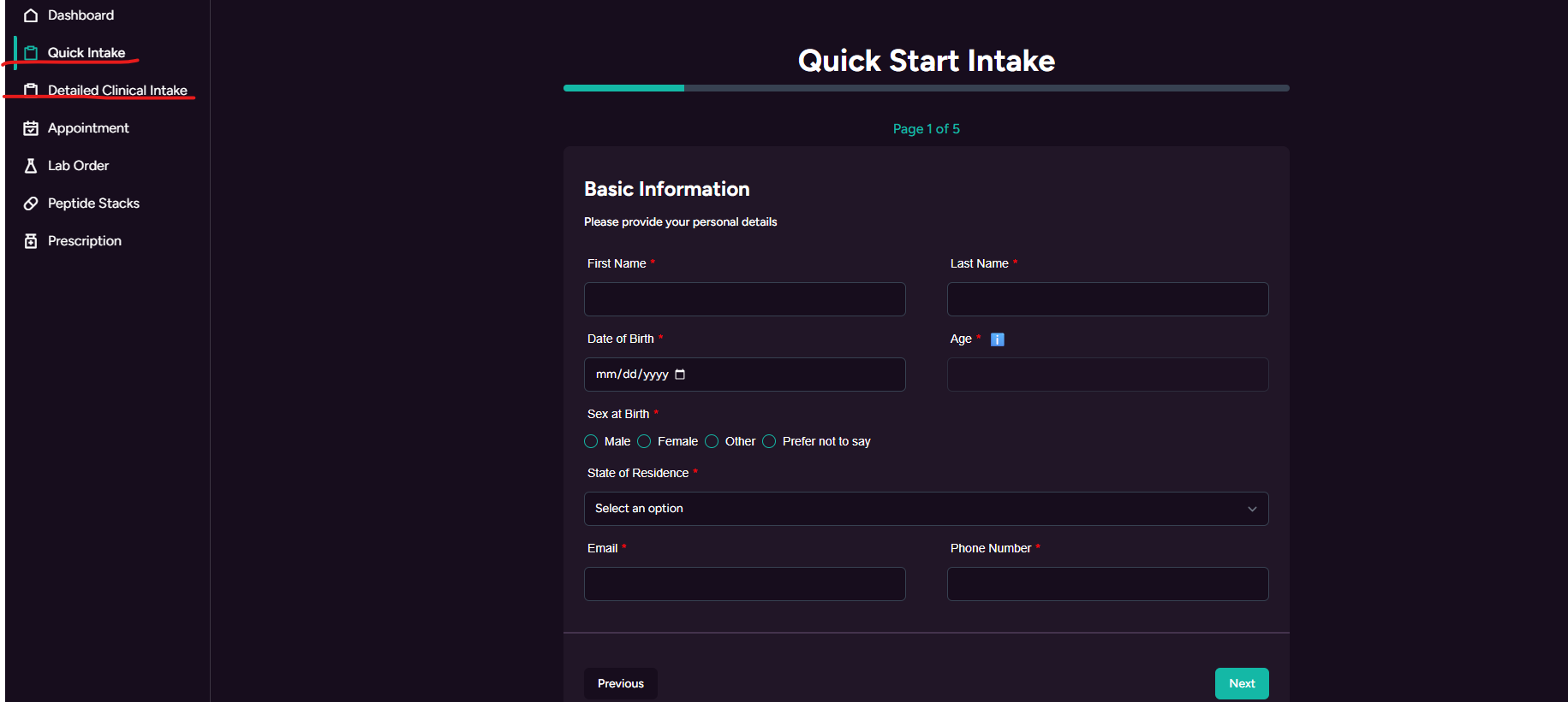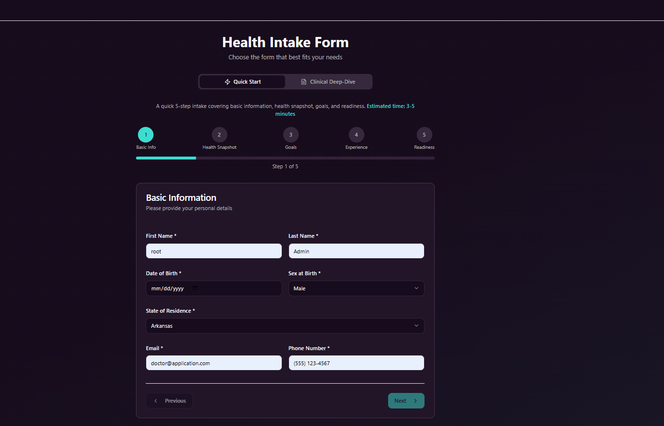 - Verify intake form is clearly split into two sections: Quick Start Intake and Clinical Deep Dive Intake.