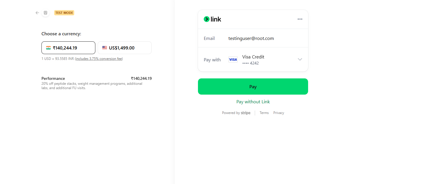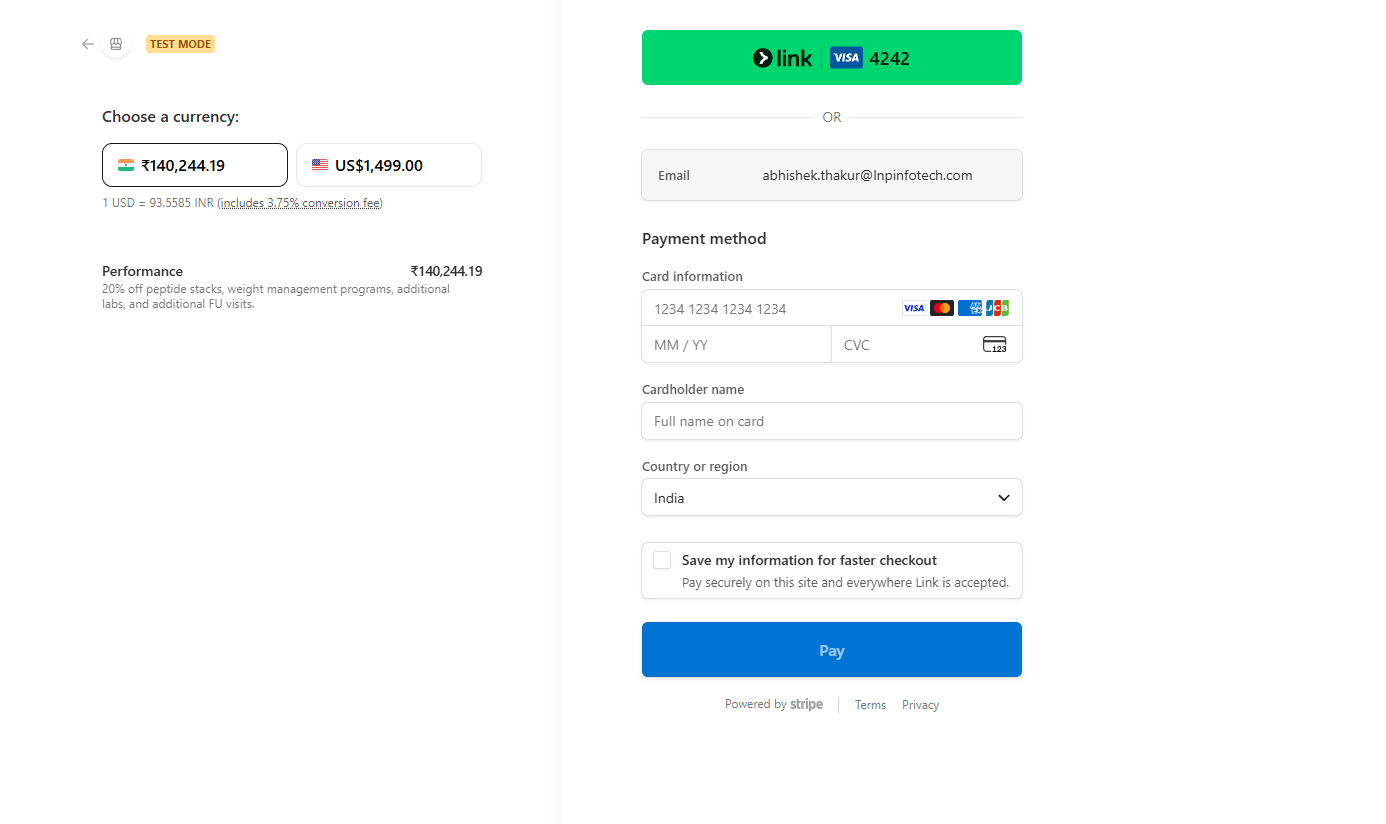 - Verify Stripe Link displays saved card details when a card is already saved.