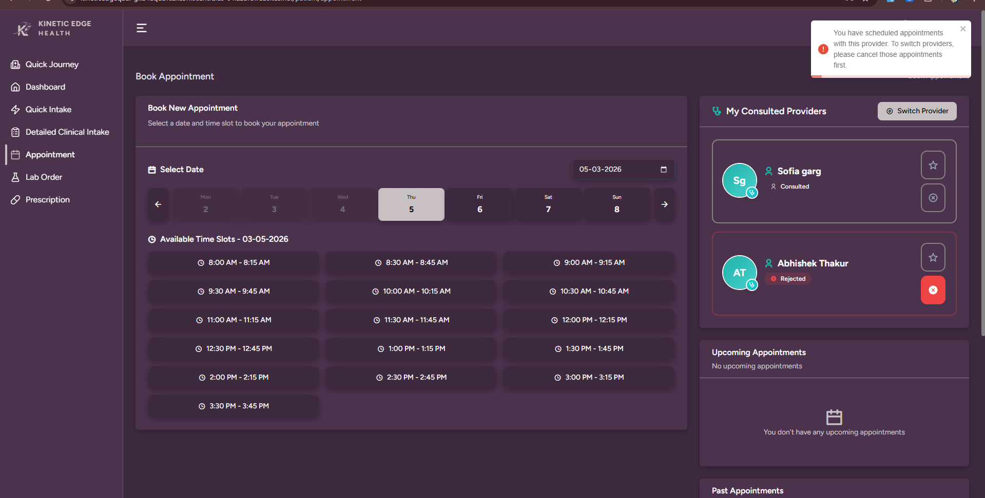 The provider switch works for the first provider, but when attempting to switch again for a patient who has two providers, the system shows the message "You have scheduled appointments with this provider. To switch providers, please cancel those appointments first." even though the patient has no upcoming appointments.