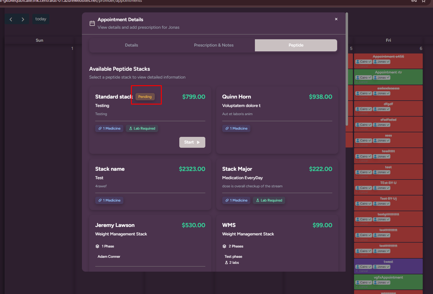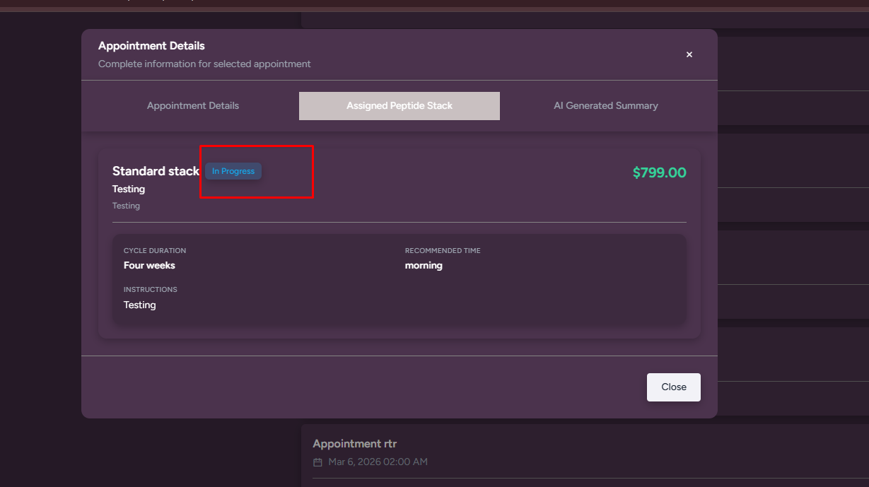 When a provider assigns a peptide to a patient, the patient purchases it. After that, when the provider starts the peptide, its status in the Patient module changes to In Progress, but on the Provider side it still remains Pending.