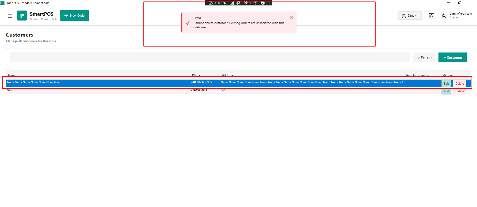 No validation is present for customer name length; a character limit should be added to prevent excessively long inputs.