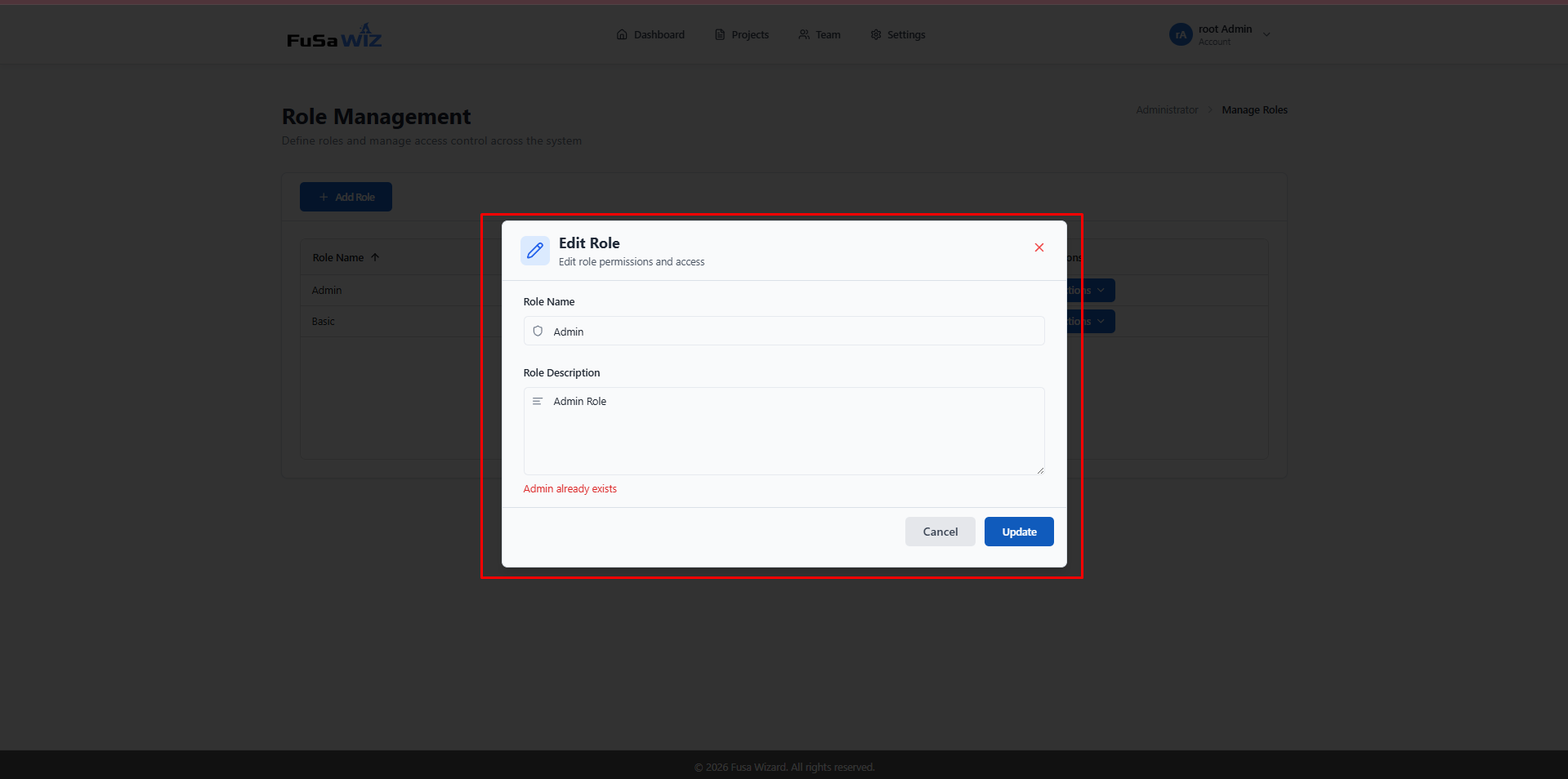 Role Management > While delete role admin and basic role," already exist role" error appeared.